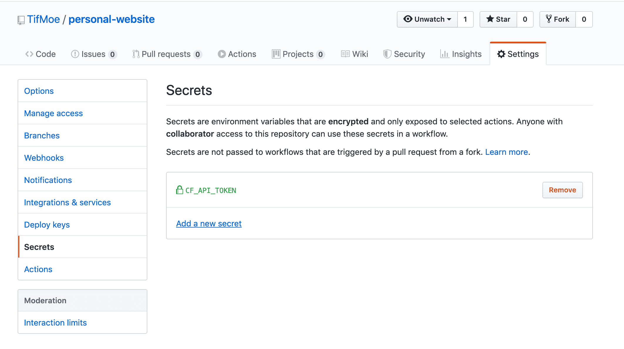 Then you can add the CF_API_TOKEN secret to your github project like I did here: