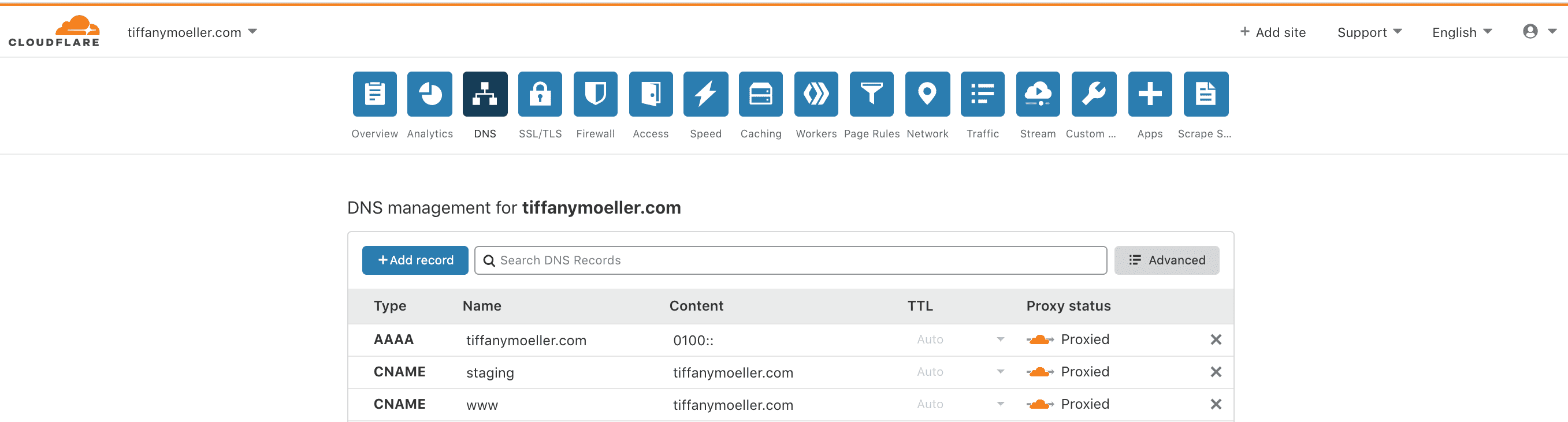 To create a new staging subdomain, all you need to do is add a new CNAME record in your Cloudflare DNS settings to point staging to your root domain! This is what it looked like when I configured mine: