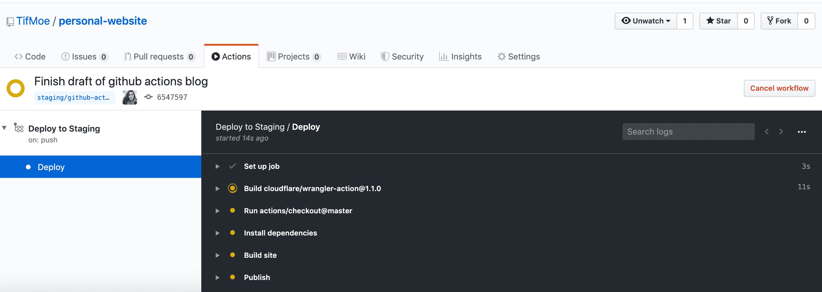 entry-point = "workers-site"This will let me deploy things to staging.tiffanymoeller.com before they are deployed to tiffanymoeller.com! Now we just need to define the automatic deployment pipelines using github actions!