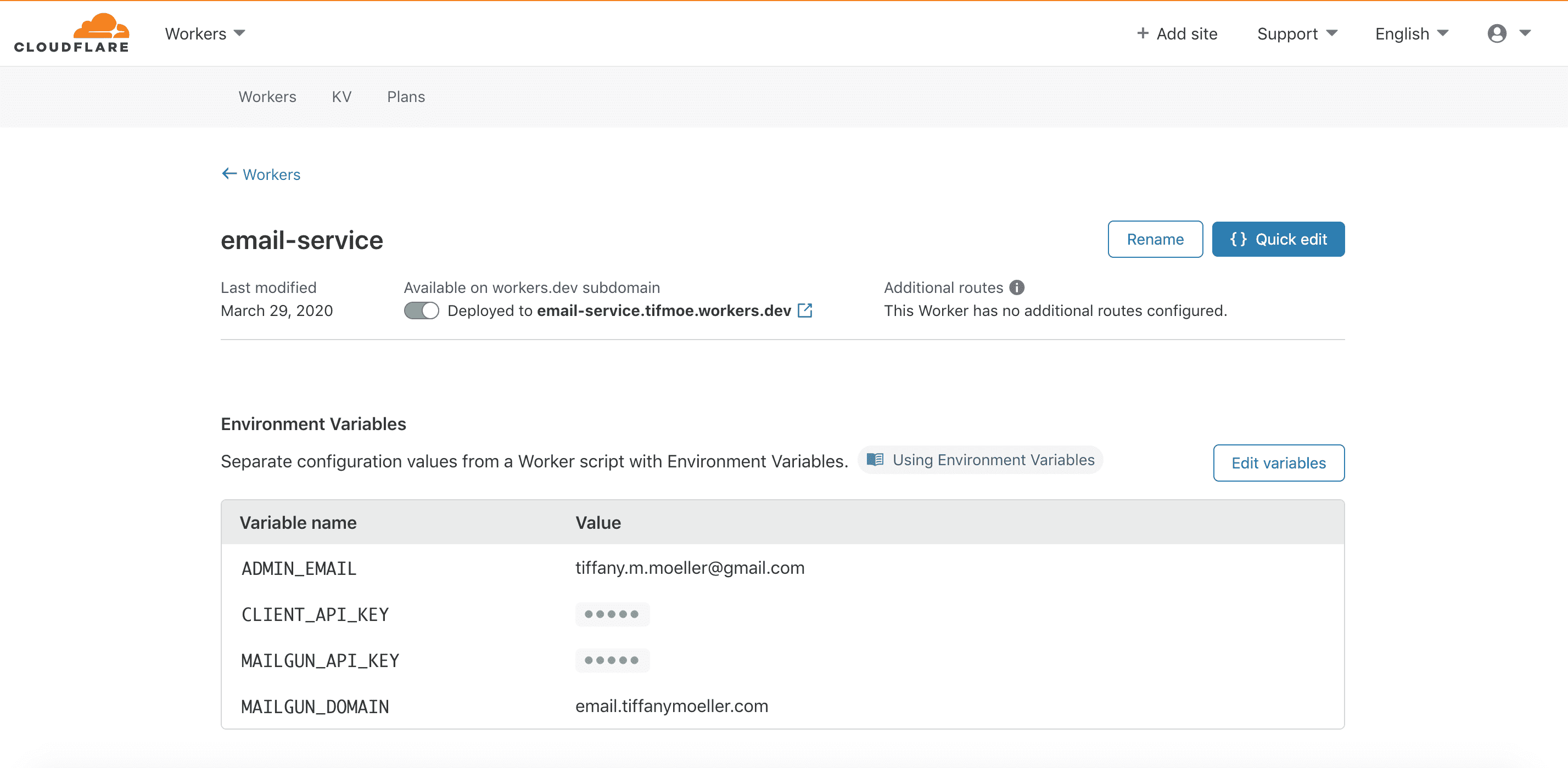 Luckily, we can do that with another Cloudflare worker! I'm also going to leverage the new functionality to add environment variables to Workers scripts which was released last month.